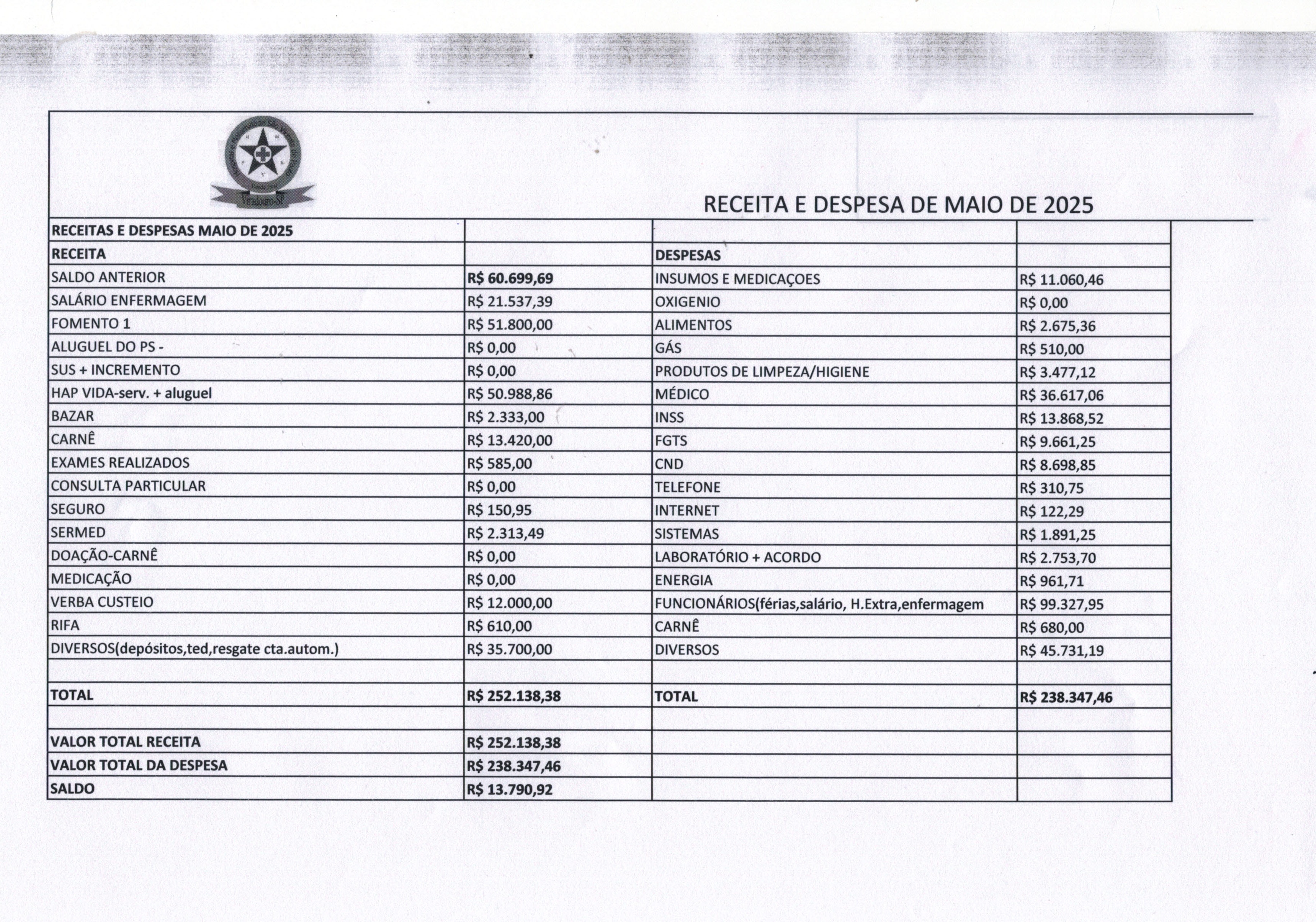 RECEITAS E DESPESAS MAIO 2025RECEITAS E DESPESAS MAIO 2025 AnexosRECEITAS E DESPESAS MAIO 2025 Download Visualizar |
