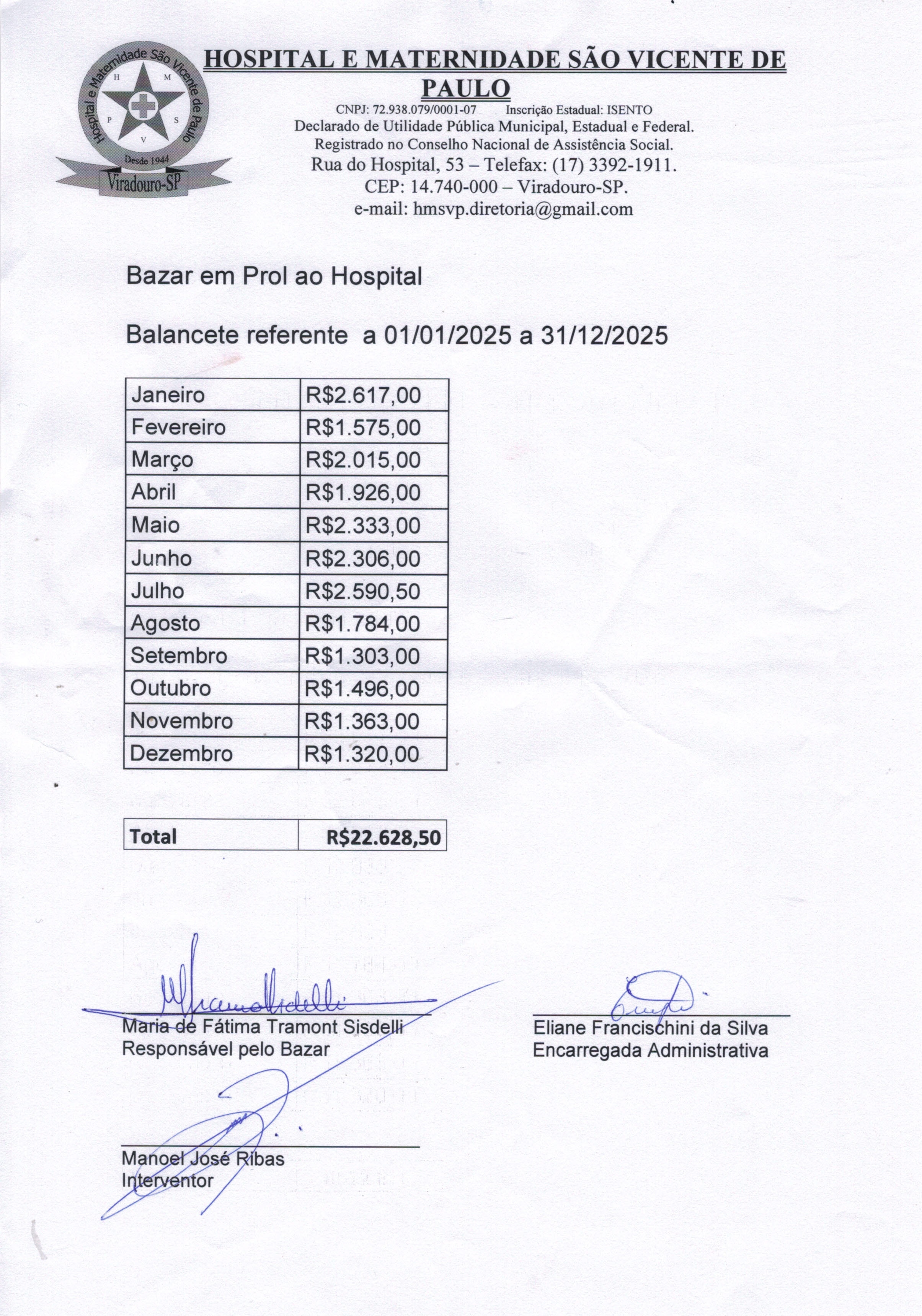BALANCETE BAZAR EM PROL AO HOSPITAL 01/01/2025 Á 31/12/2025BALANCETE BAZAR EM PROL AO HOSPITAL 01/01/2025 Á 31/12/2025 AnexosBALANCETE BAZAR EM PROL AO HOSPITAL 01/01/2025 Á 31/12/2025 Download Visualizar |