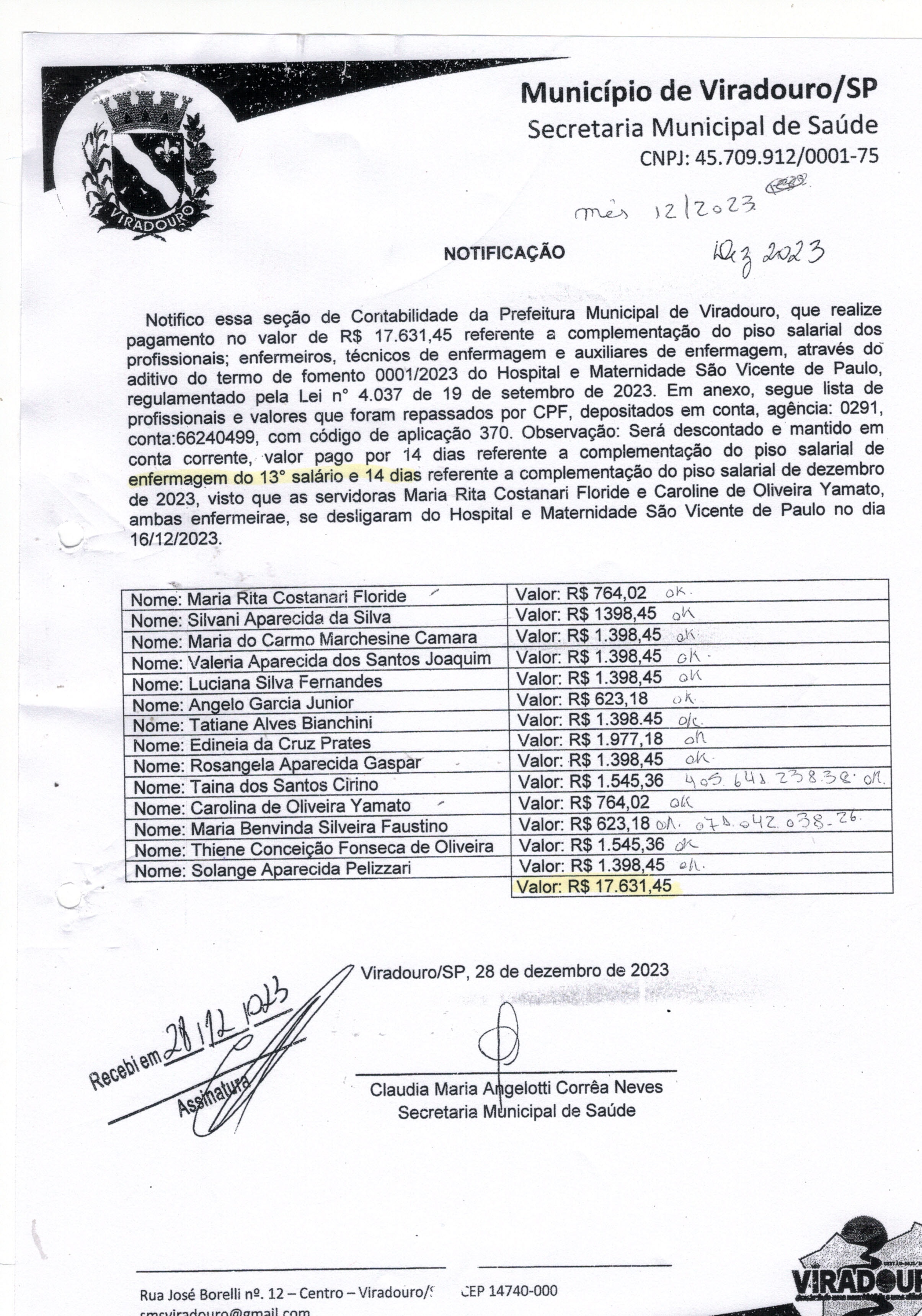 COMPLEMENTAÇÃO PISO SALARIAL ENFERMAGEM DEZEMBRO 2023